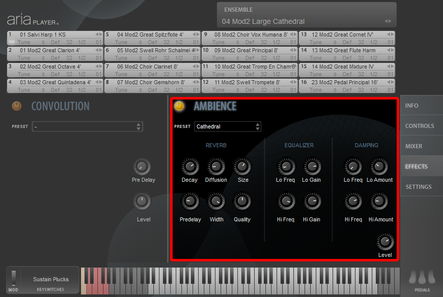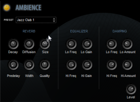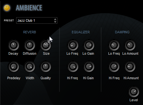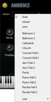 For individual instrument patchesA particular instrument sound, often containing multiple samples. The term is borrowed from physical synthesizers in which cables were used to connect sound modules. Also referred to as program. and most ensemble presets, Ambience reverb is turned on by default and to deactivate it you must click the on/off switch (
